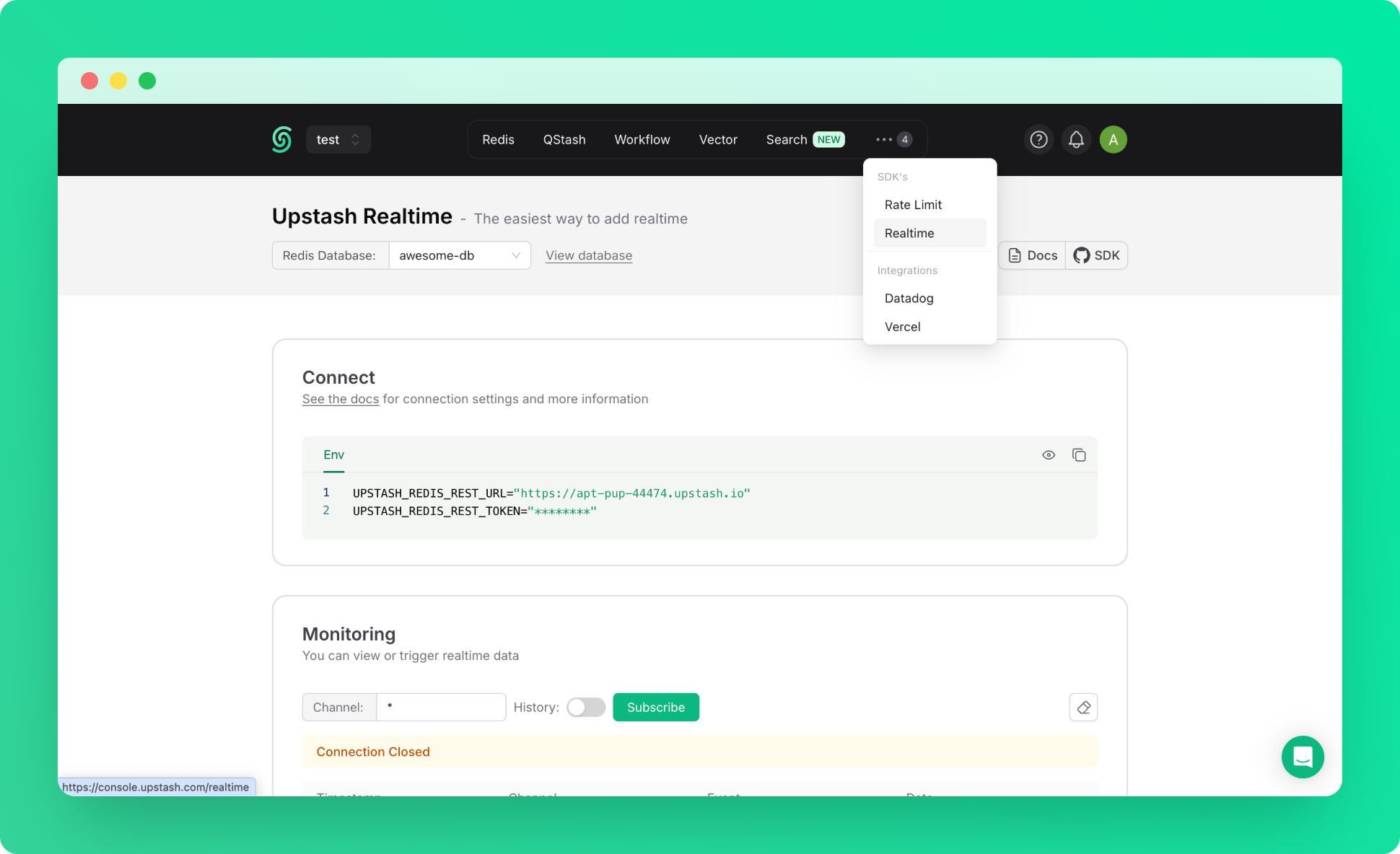 Upstash Realtime is powered by Redis Streams. Grab your credentials from the Upstash Console.