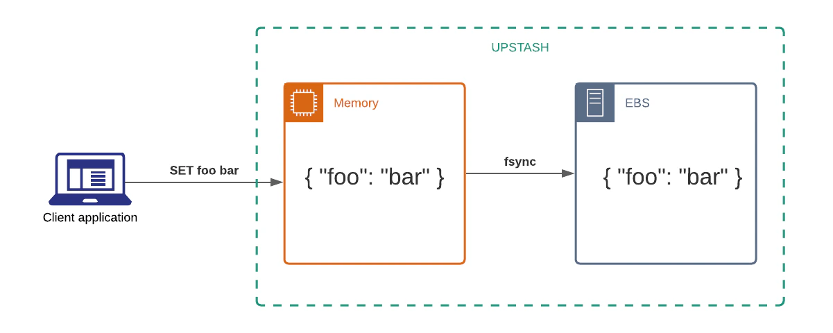 In Upstash, persistence is always enabled, setting it apart from other Redis offerings. Every write operation is consistently stored in both memory and the block storage provided by cloud providers, such as AWS’s EBS. This dual storage approach ensures data durability. Read operations are optimized to first check if the data exists in memory, facilitating faster access. If the data is not in memory, it is retrieved from disk. This combination of memory and disk storage in Upstash guarantees reliable data access and maintains data integrity, even during system restarts or failures.